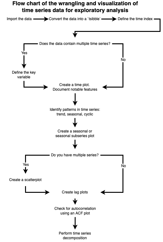This specific post provides an example of exporting Google Analytics 4 data from BigQuery and importing it into R, a statistical programming language. Then, it focuses on documenting the wrangling, visualization, and exploratory analysis steps involved when working with time series data. Lastly, the exploratory analysis is used to narrow the analysis’ scope, where specific series will be identified as potential candidates to be included in a model forecasting order completion page views on the Google Merchandise store. To help summarize the exploratory analysis steps performed here, I have created the following flow chart:
