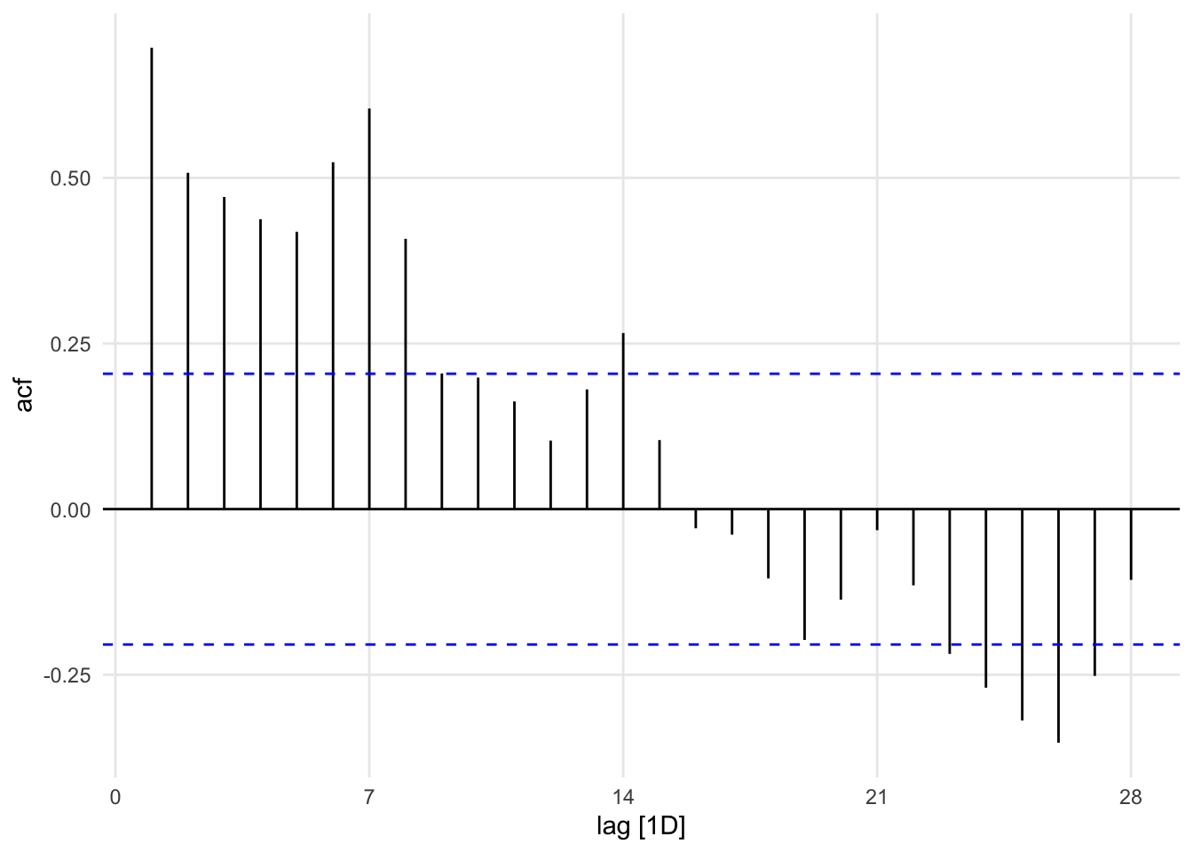The plot also reveals a slight scalloped shape (i.e., peaks and valleys at specific intervals), which suggests some seasonality occurring within the process. Indeed, it seems peaks occur every seven days (e.g., lags 7 and 14). Thus, a slight weekly seasonality may be present within the time series.