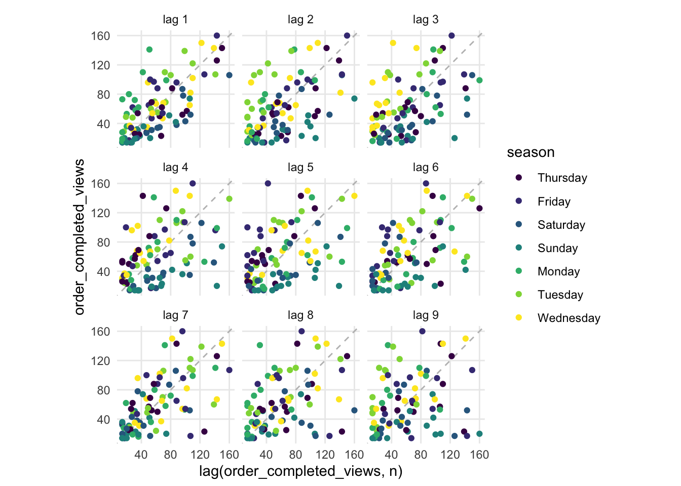 gg_lag(order_completed_views, geom = "point")Warning: `gg_lag()` was deprecated in feasts 0.4.2.