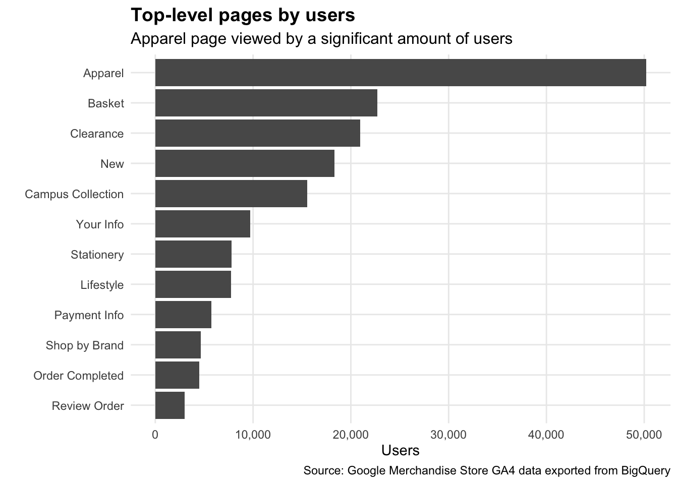 mutate(string_value = str_to_lower(string_value))The filtering resulted in a reduced data set (i.e., ~1 million rows). Since the intent was to further narrow the analysis’ scope, additional filtering was performed. Specifically, the data were filtered to return a data set containing the top-level pages identified previously.