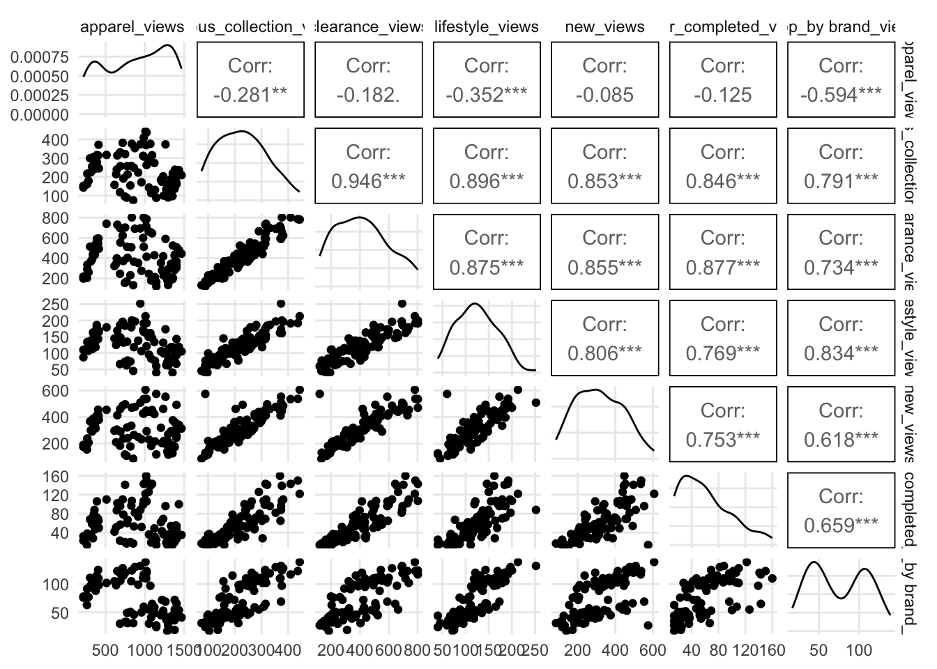 The scatterplots and correlations output revealed some interesting relationships. For one, although previous exploratory analysis revealed apparel generated high volumes of views, the correlation analysis revealed a slight negative relationship with order completions. However, five variables seem to be highly correlated with order completions: Clearance (.877), Campus Collection (.846), Lifestyle (.769), New (.753), and Shop by Brand (.659). Evidence points to these series as being potentially valuable components of a forecasting model of Order Completed page views.