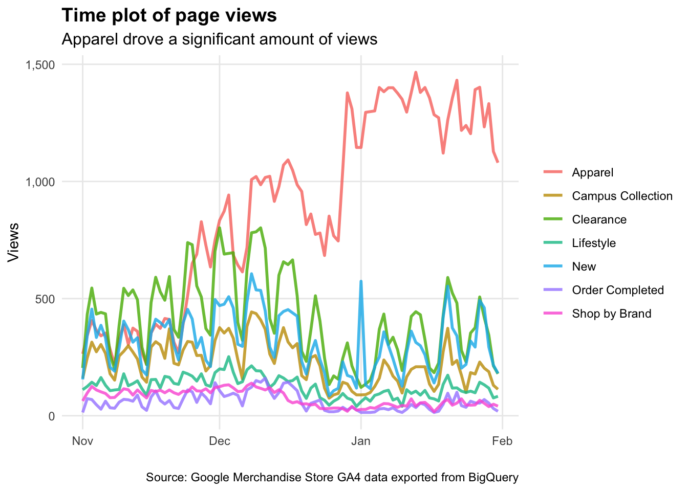 The exploratory analysis is now complete, and this will be the conclusion of this post within the series. This post first started with exporting Google Analytics 4 data and wrangling it into a state suitable for exploratory analysis. Then, several iterations of narrowing the analysis’ scope were performed. Future posts will aim to utilize findings from this exploratory analysis to develop a model forecasting order completed page views.