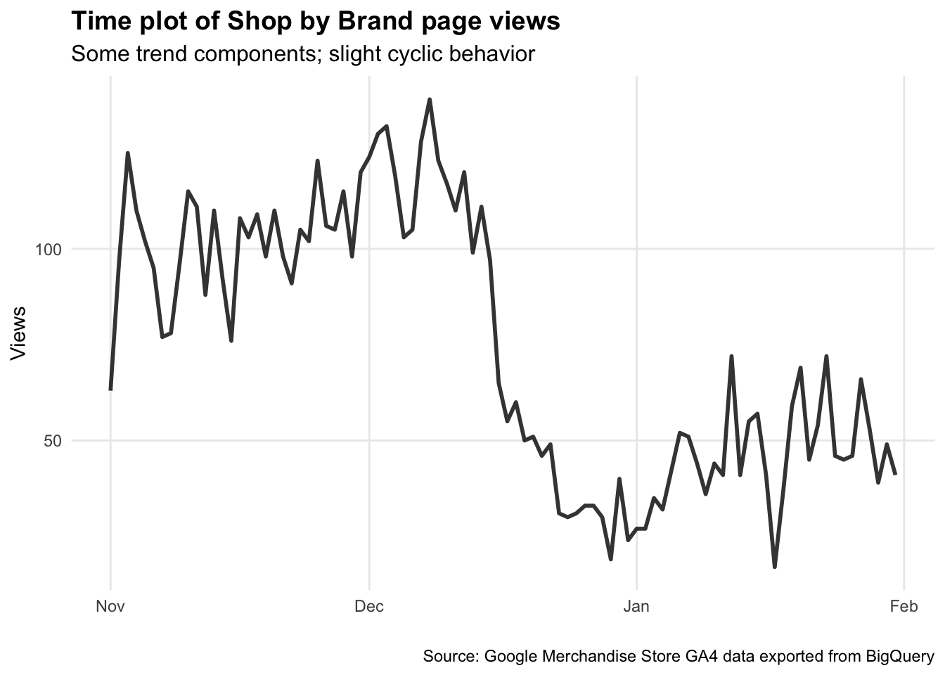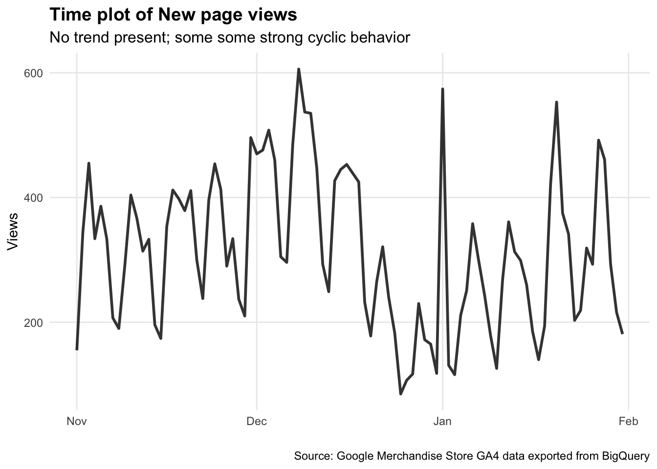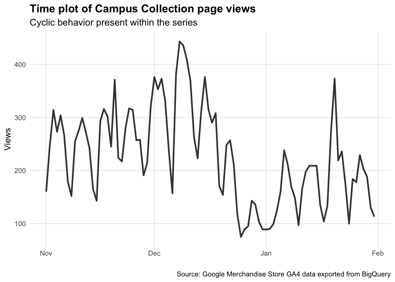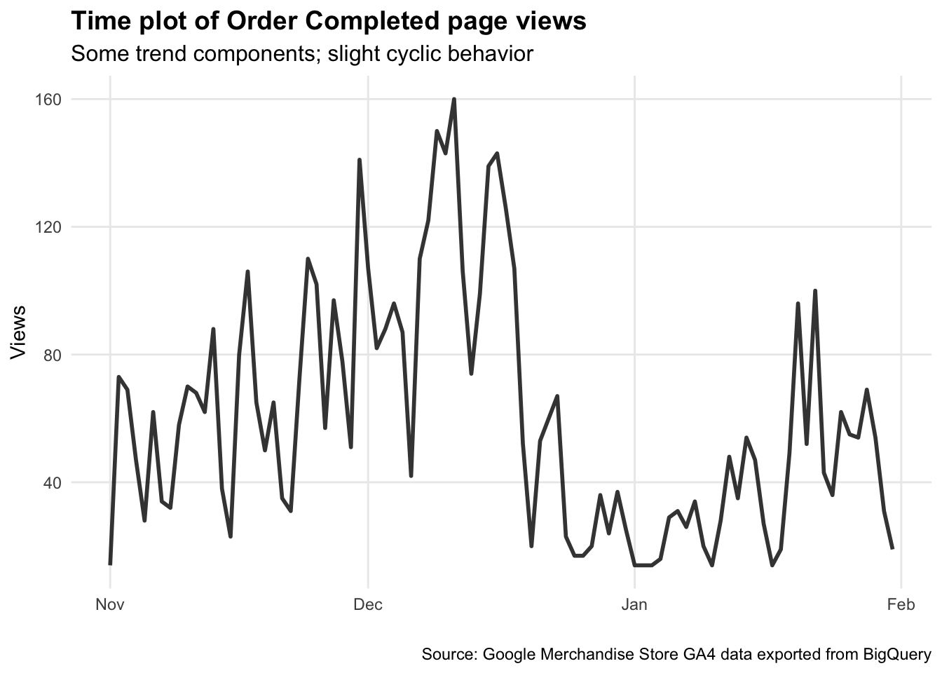 This series of blogposts will focus on creating forecasts using Google Analytics 4 data. Specifically, this series overviews the steps and methods involved when developing forecasts of time series data. This blog series begins with a post overviewing the wrangling, visualization, and exploratory analysis involved when working with time series data. The primary focus of the exploratory analysis will be to identify interesting trends for further analysis and application within forecasting models. Then, subsequent posts will focus on developing different forecasting models. The primary goal of this series is to generate a forecast of online order completions on the Google Merchandise store.