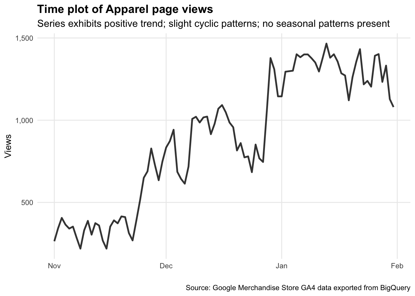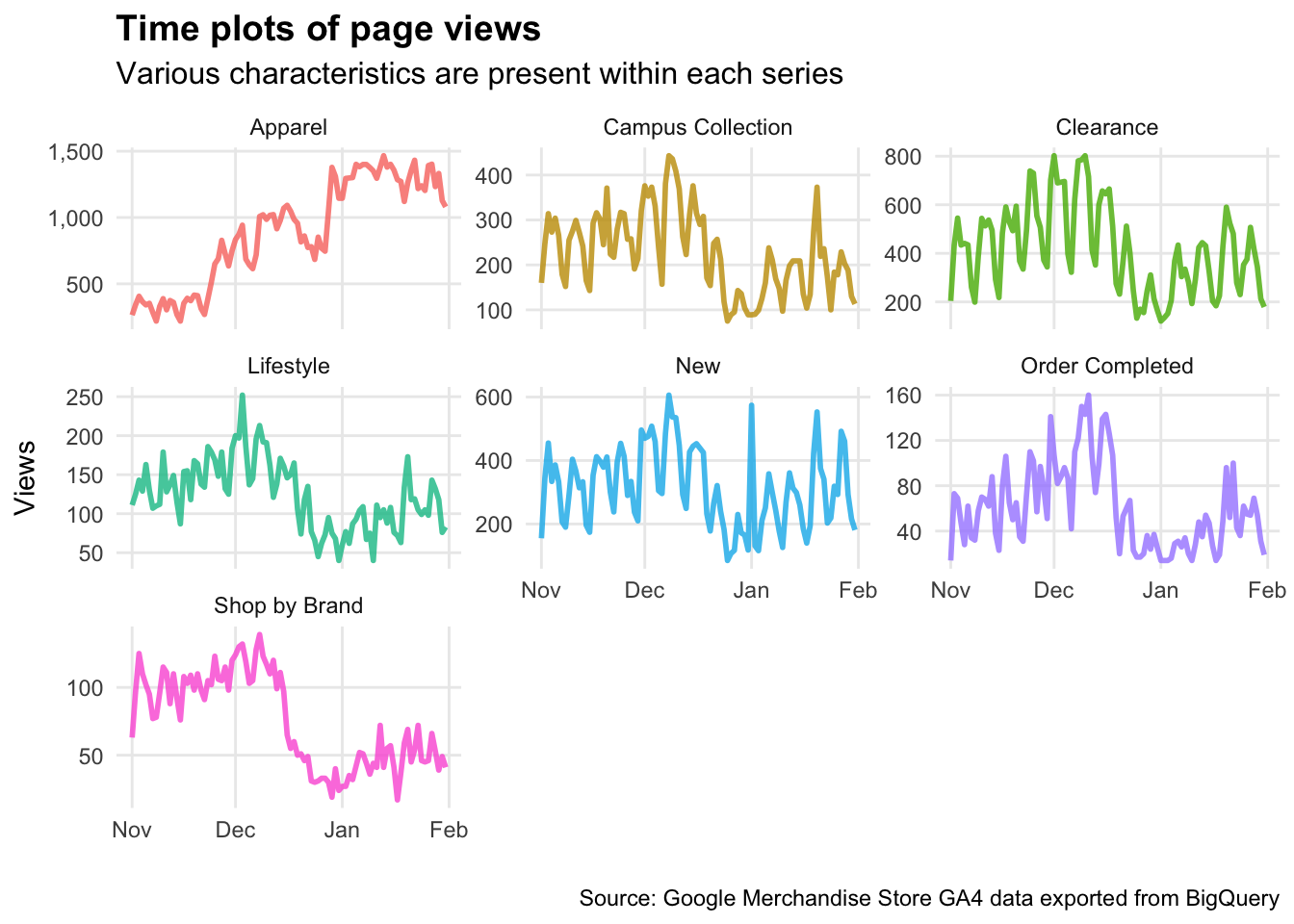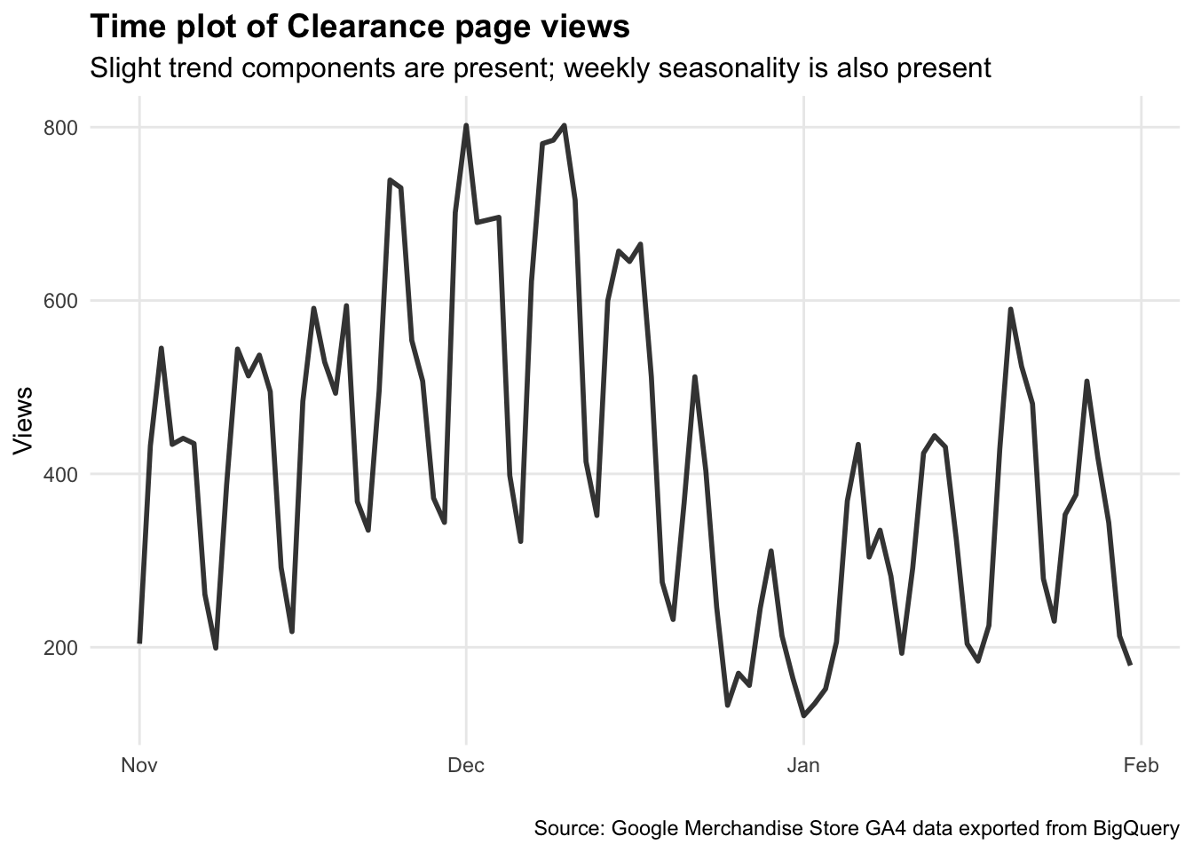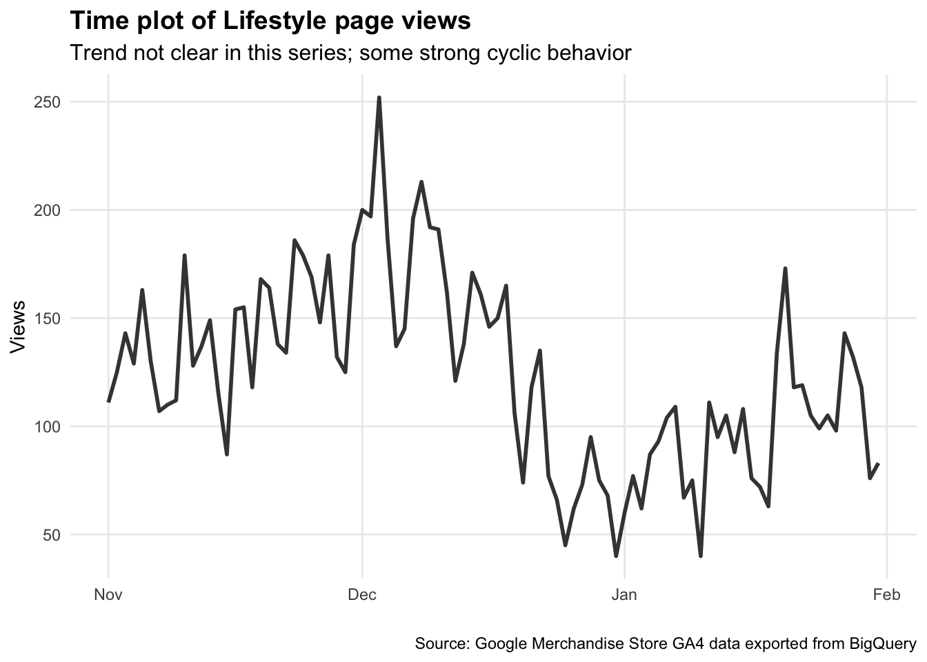 This series of blogposts will focus on creating forecasts using Google Analytics 4 data. Specifically, this series overviews the steps and methods involved when developing forecasts of time series data. This blog series begins with a post overviewing the wrangling, visualization, and exploratory analysis involved when working with time series data. The primary focus of the exploratory analysis will be to identify interesting trends for further analysis and application within forecasting models. Then, subsequent posts will focus on developing different forecasting models. The primary goal of this series is to generate a forecast of online order completions on the Google Merchandise store.