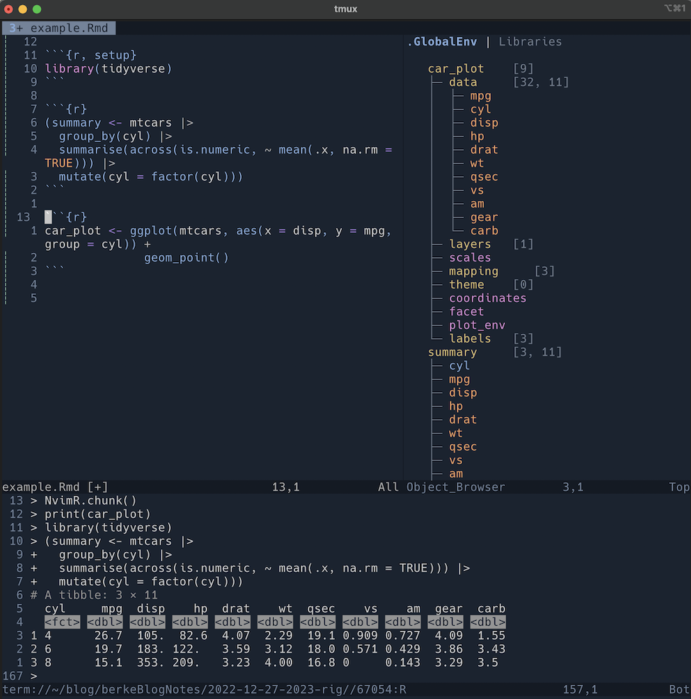 The power of Nvim-R comes from its predefined keybindings keybindings, which allow you to quickly and easily do interactive analysis tasks using just a few keystrokes. I’ve found it’s the best option to work with R in Neovim. A whole blog post could be written about the use of Nvim-R, and I only hit the highlights here. I highly suggest checking it out if you’re looking to write R code with Neovim.