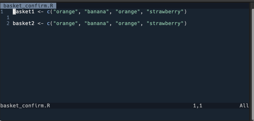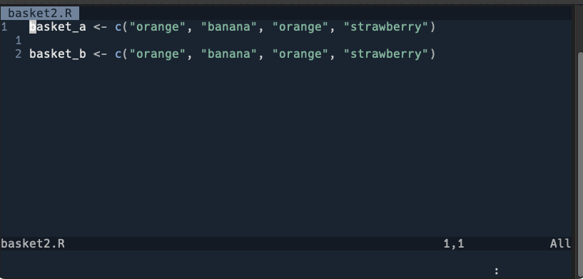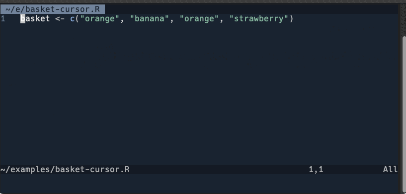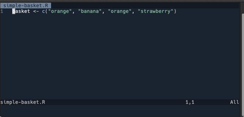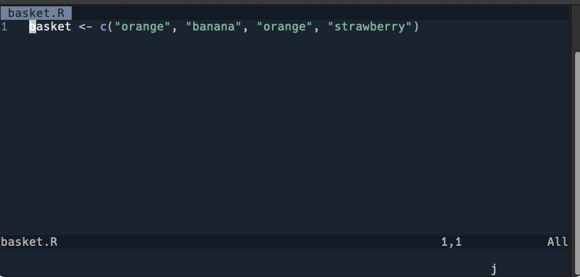 :s can be used to find each occurance of a text string, and replace it with another text string. Say I have a character vector basket, and it contains an assortment of fruit. However, what if I want to replace the first apple in my basket with an orange using :s? First, I need to move my cursor to the line I want to find the first string. Then, I can enter the following into the command prompt to find the first instance of the string orange and replace it with the string apple: