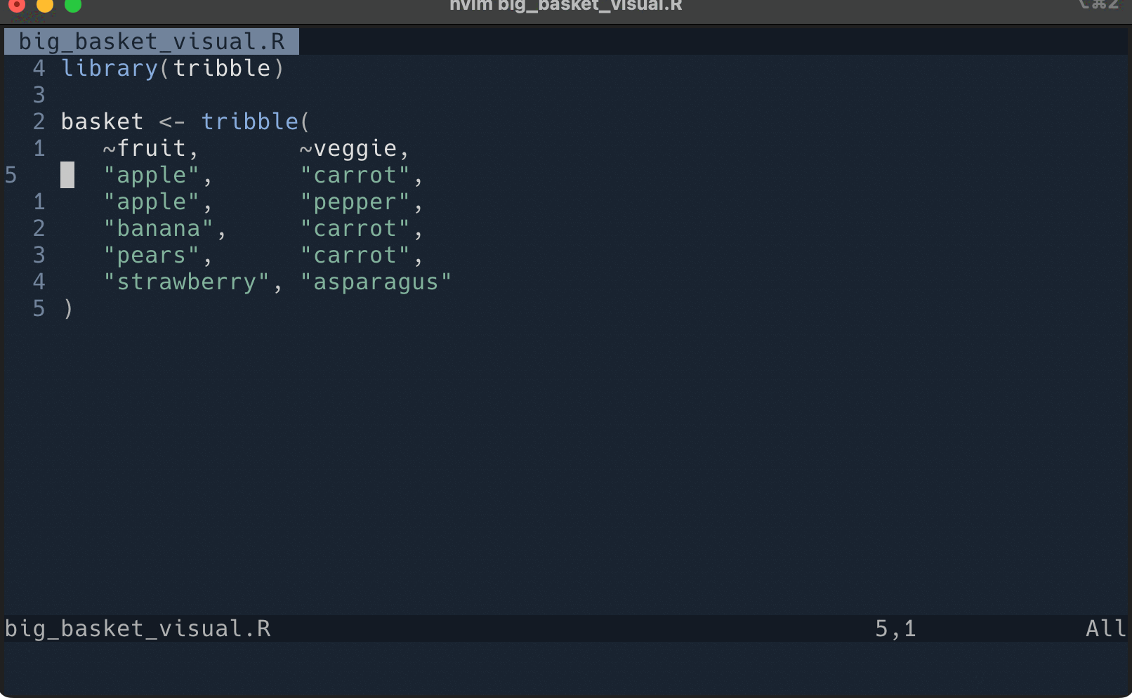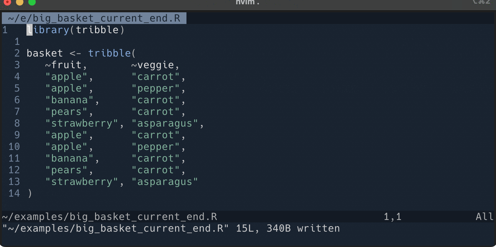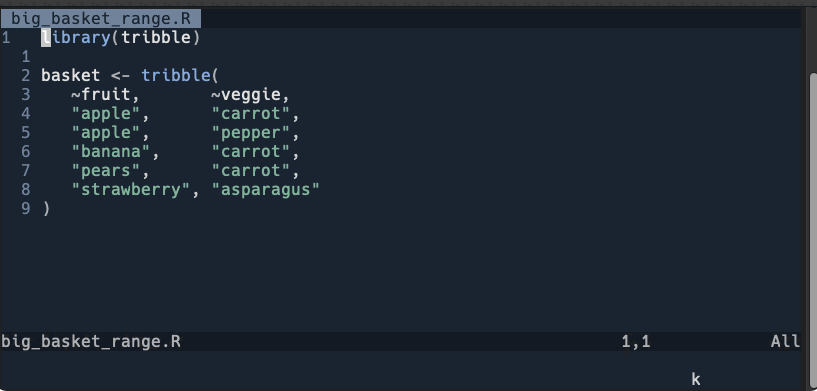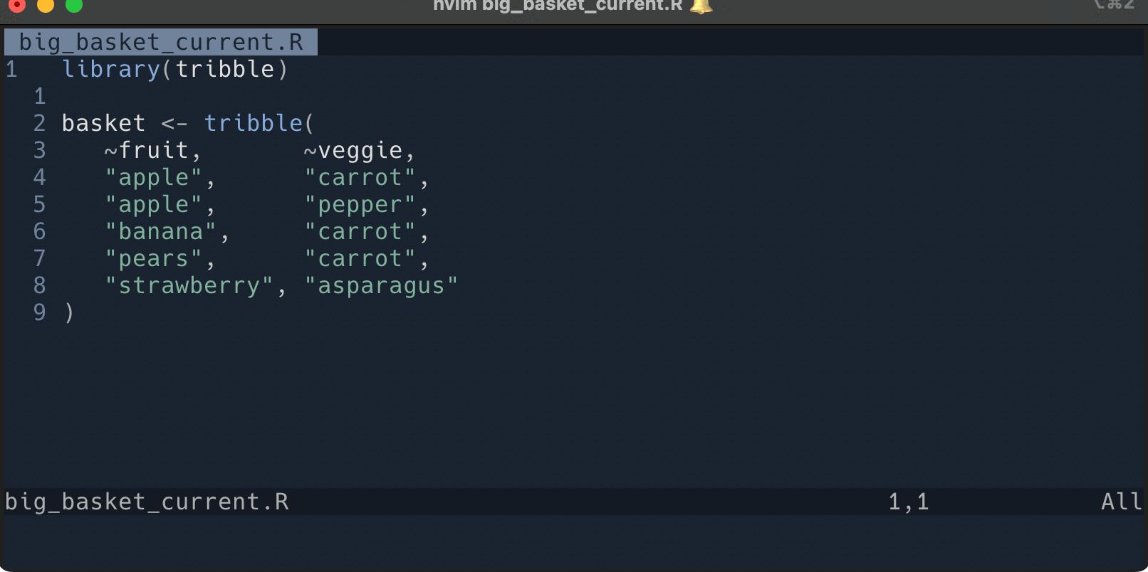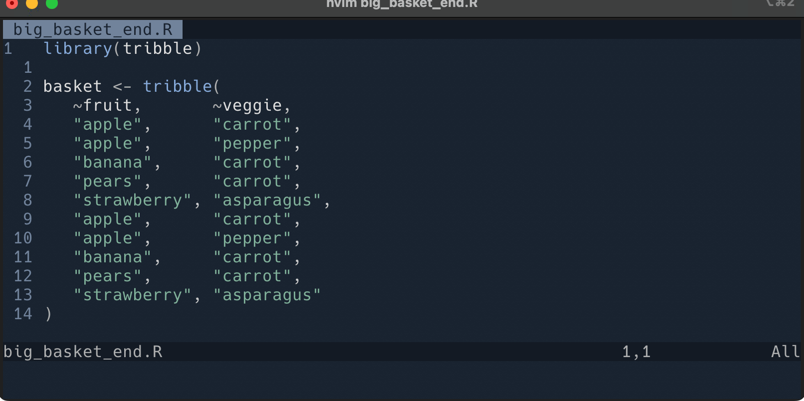Say we now have a much larger basket, one that can hold both fruits and veggies. In the R programming language, this can be modeled using a tribble from the tribble package.