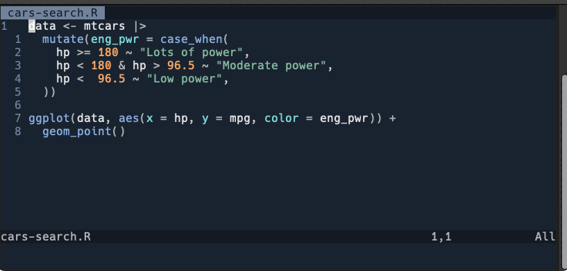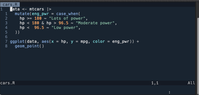 This TIL post aims to highlight some of the basics of using Vim’s :s command. My intention is to get you up and running quickly. As such, this post provides several simple examples applying the command to some practical use cases. Although most of the examples use the R programming language, these concepts can be applied to any programming language or text editing task.