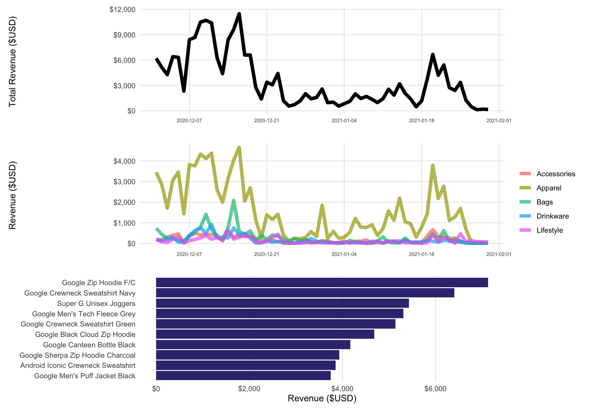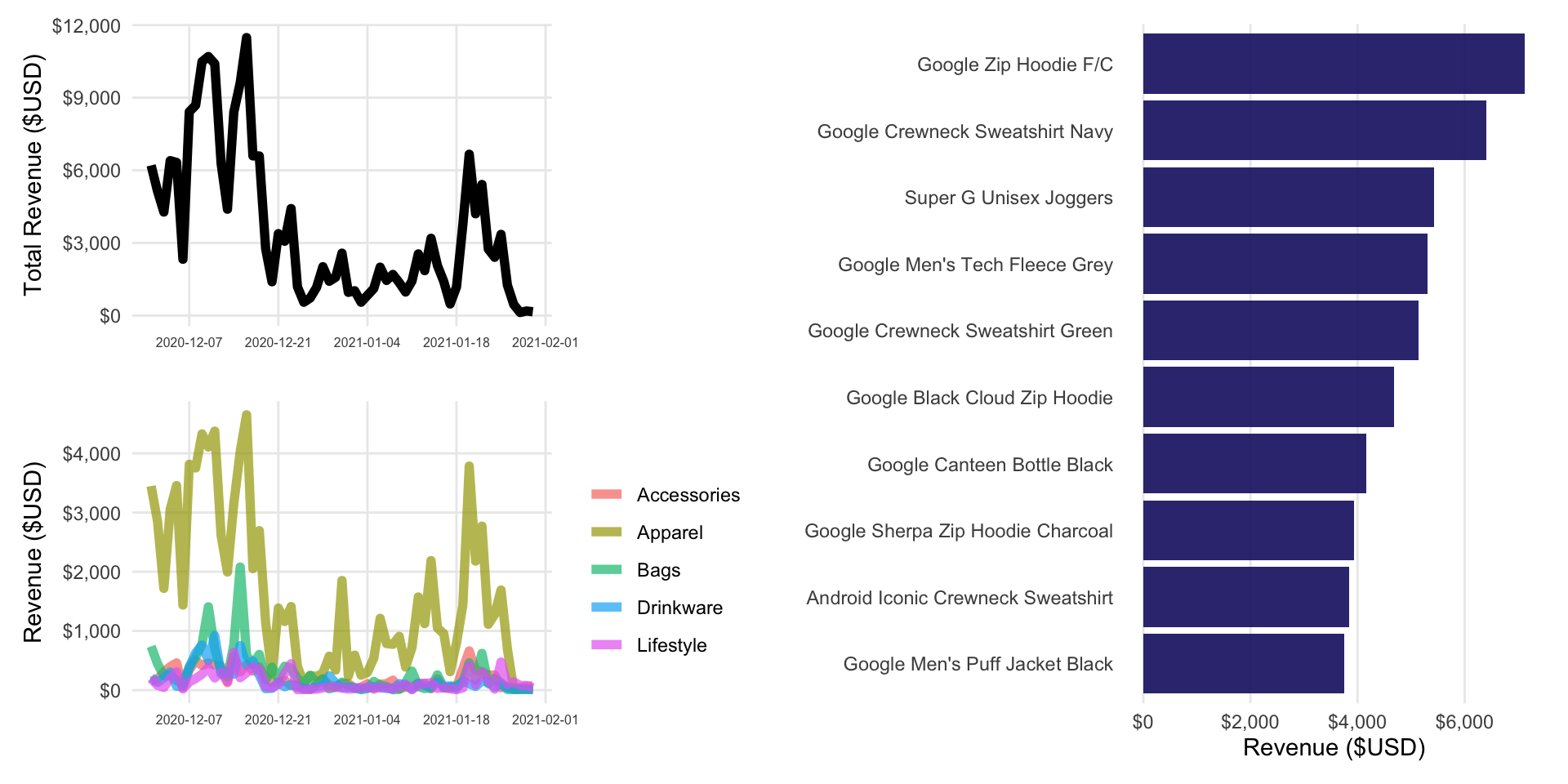 Before demonstrating some uses of the patchwork package, we’ll need to create some example plots. To do this, I’ll use example ecommerce data from the Google Merchandise Store. I’ve used this data in previous posts, so I’m going to spend little time describing this data in detail. If you’re interested in exploring this data further, check out the docs I linked earlier.