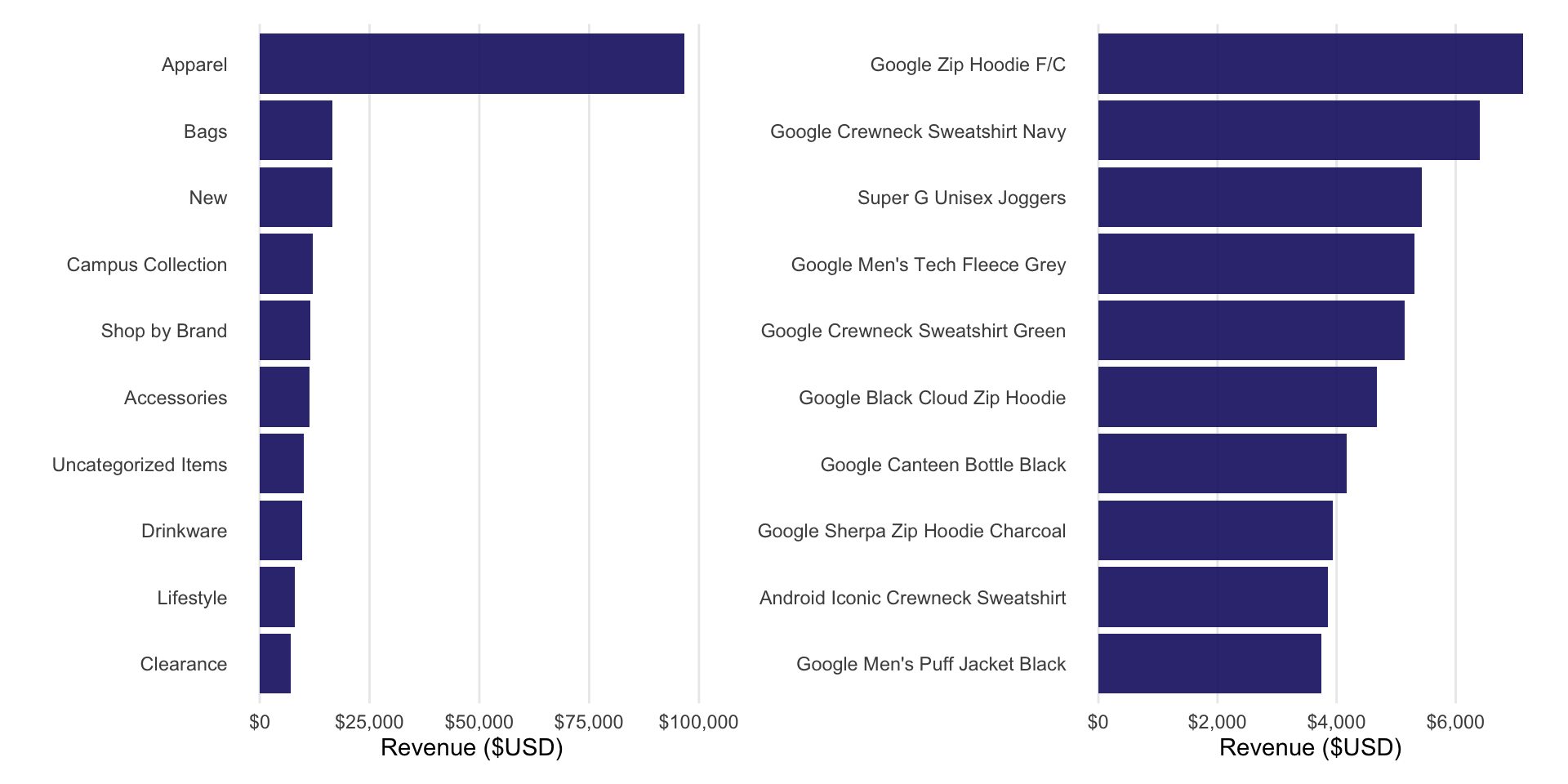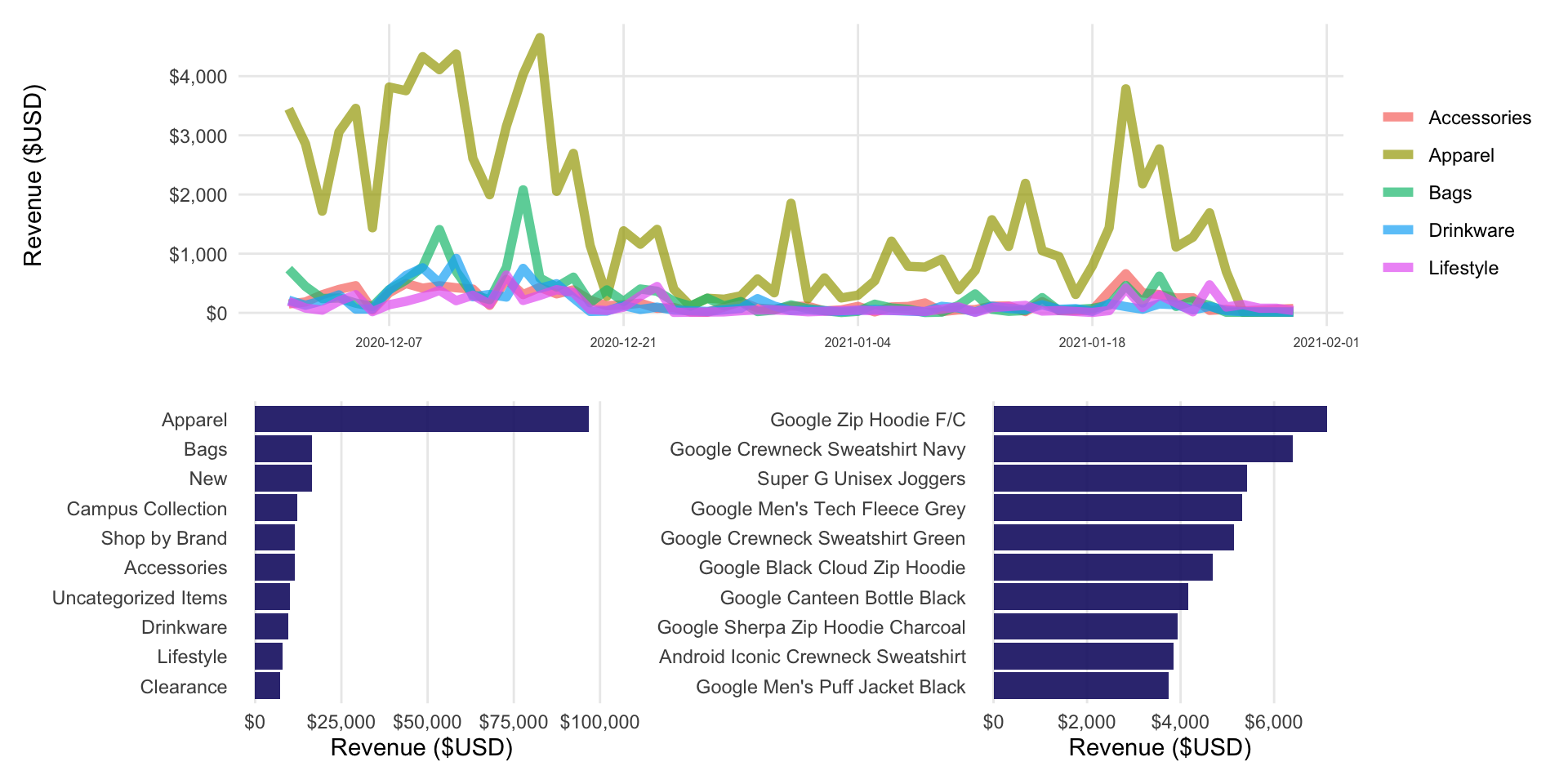 The data also categorizes items into more general groupings. As such, we can create a plot ranking product categories by amount of revenue generated. No question, it’s apparel. The code to create the plot is similar to what we did above with items.