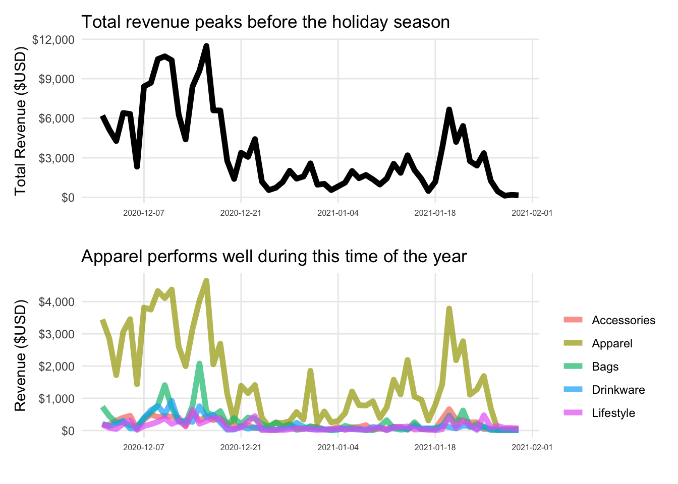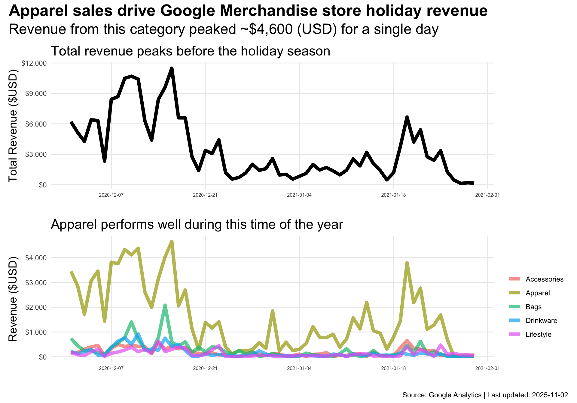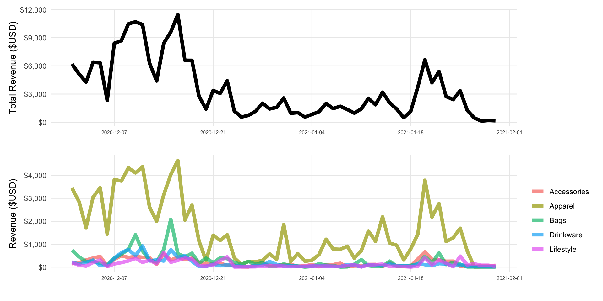 subtitle = "On one single day, apparel revenue peaked ~$4,600 (USD)",