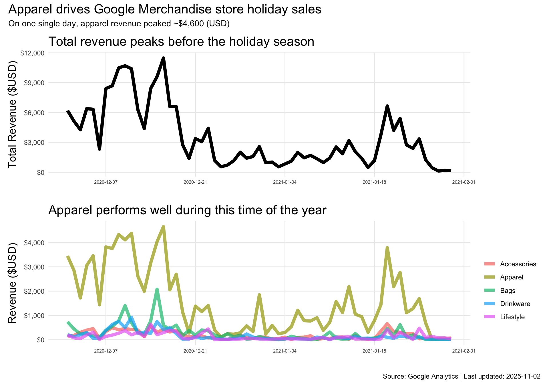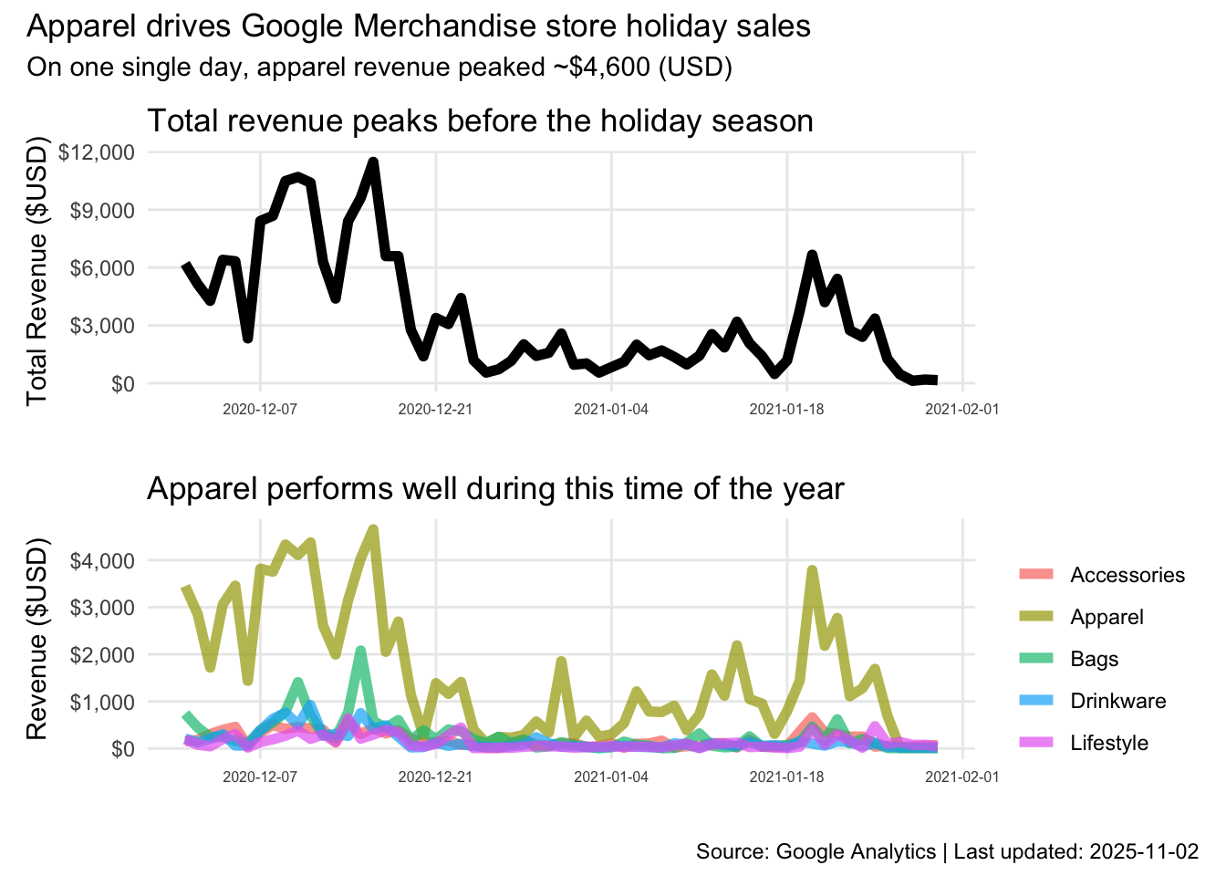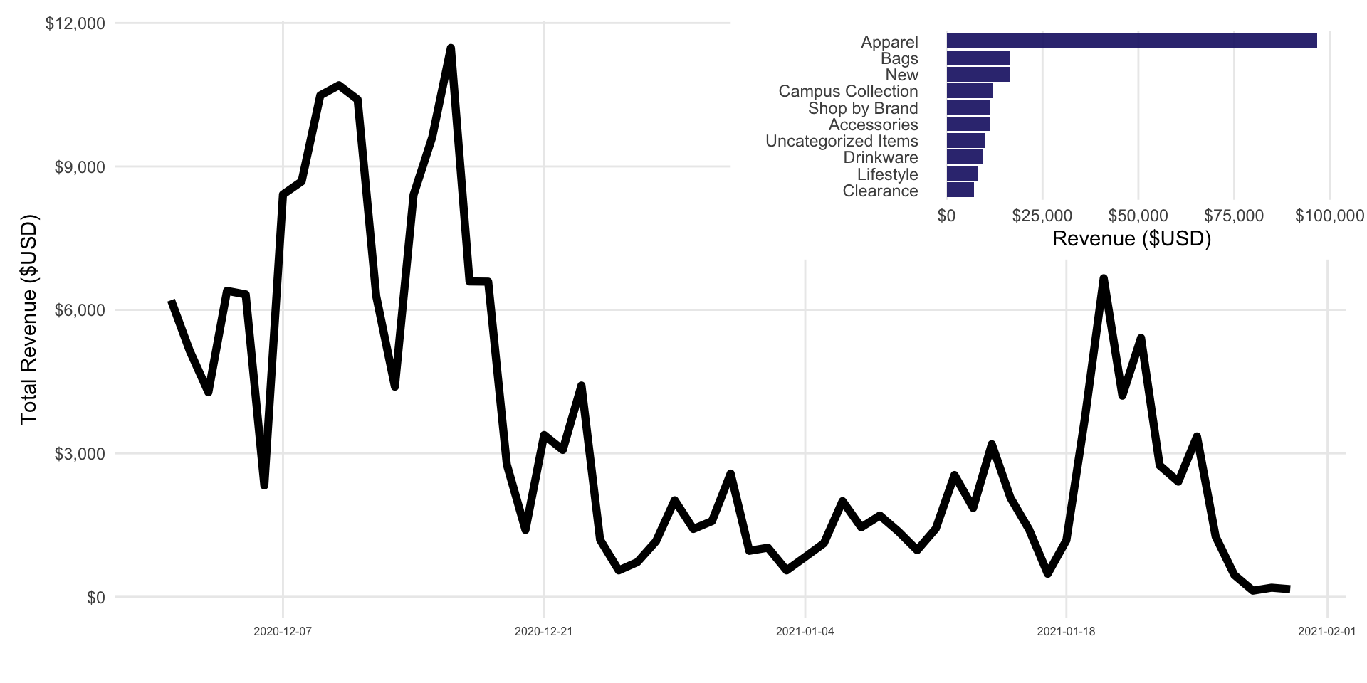 subtitle = "On one single day, apparel revenue peaked ~$4,600 (USD)",