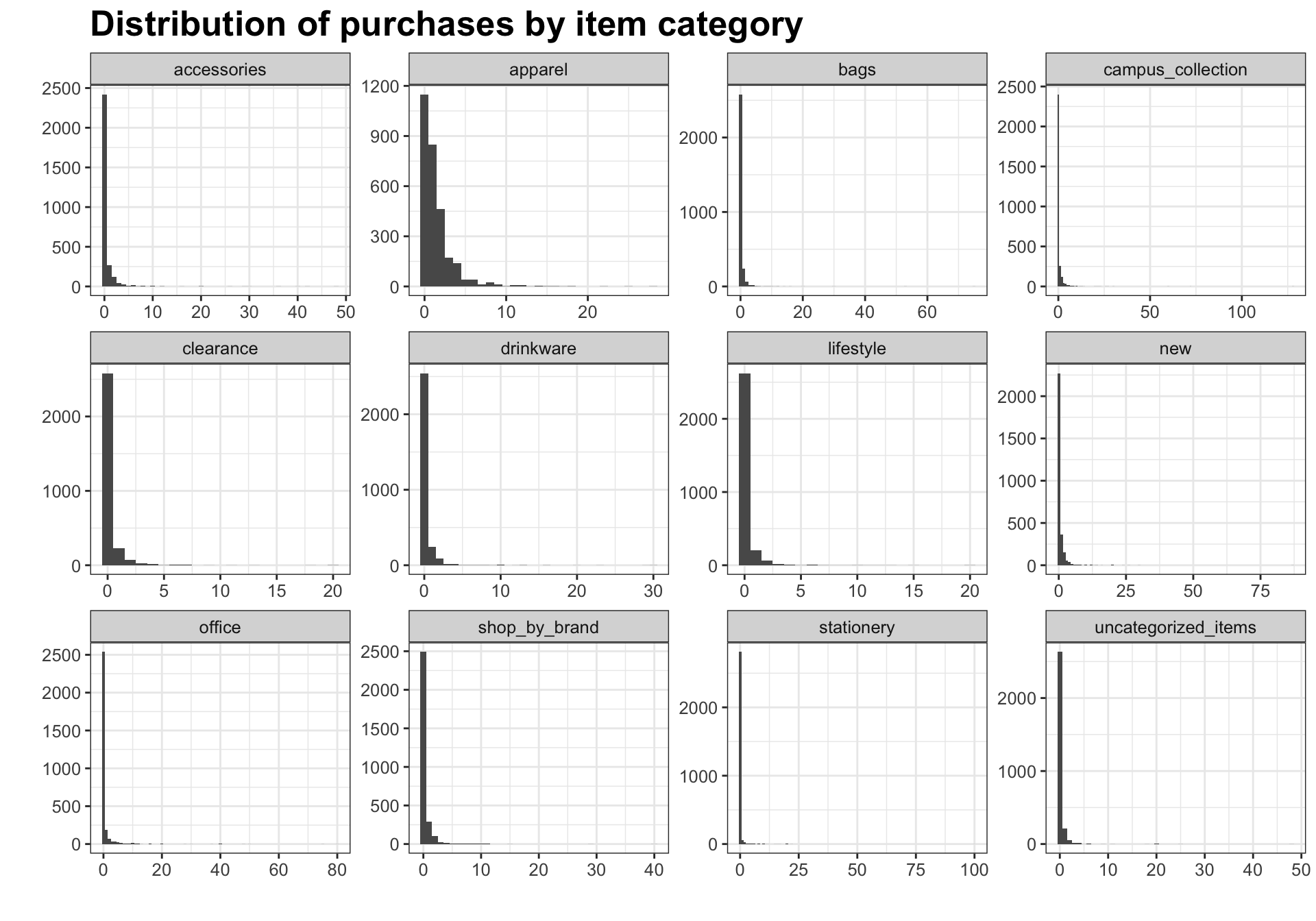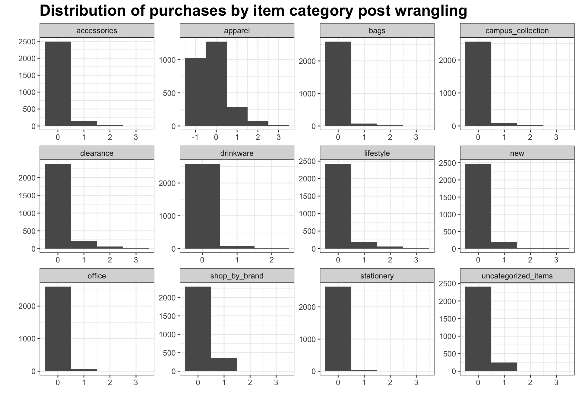 title = "Distribution of purchases by item category post wrangling",