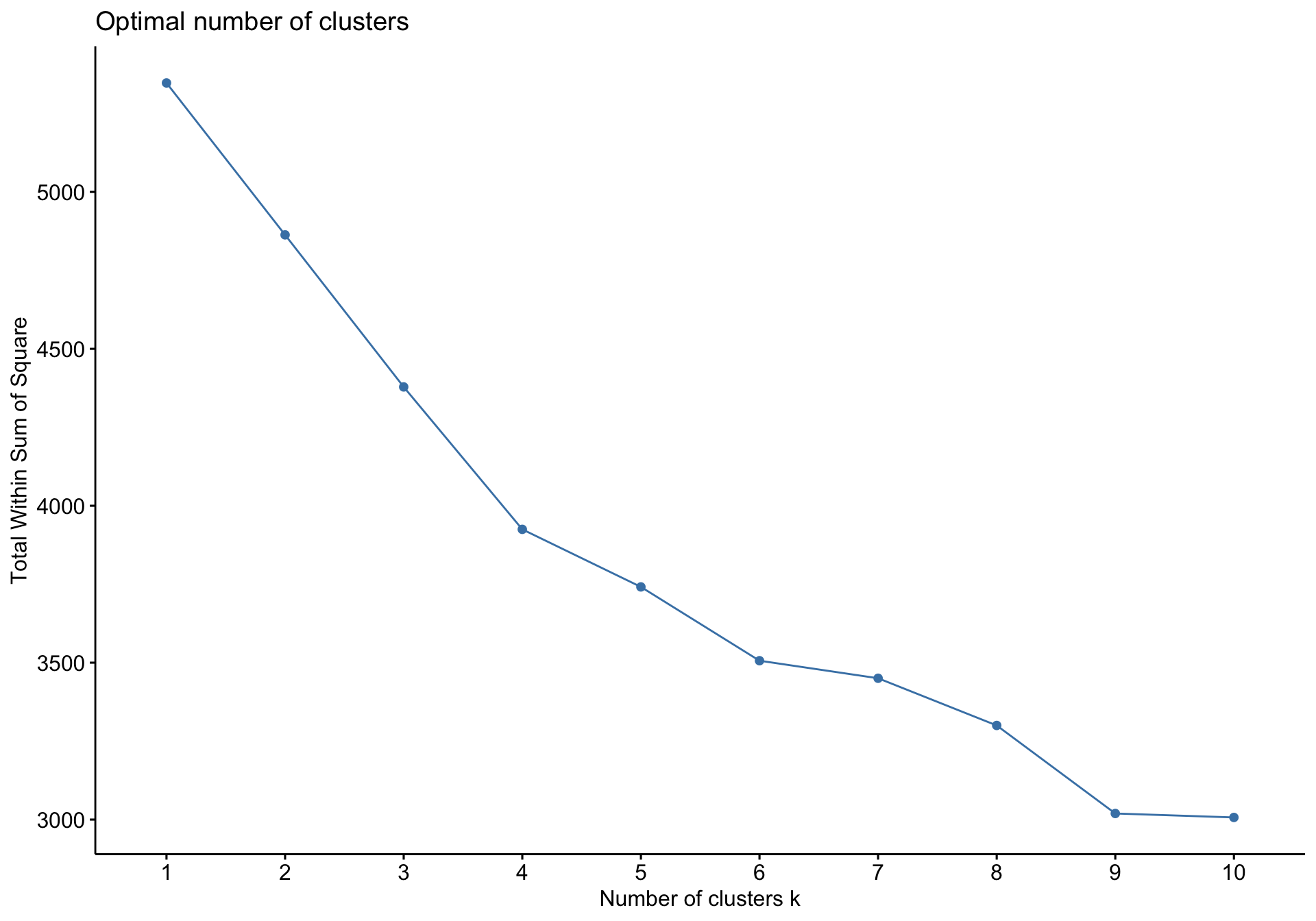 The first method is the elbow method, where we visually examine an elbow plot of the total within sum of squares based on the number of potential clusters used for the model. The fviz_nbclust() function from the factoextra package is useful here. We first pass in the data we intend to use for modeling, then base R’s stats kmeans() function. We’re also interested in creating the plot using the within sum of squares method, so we specifiy that using the method argument.