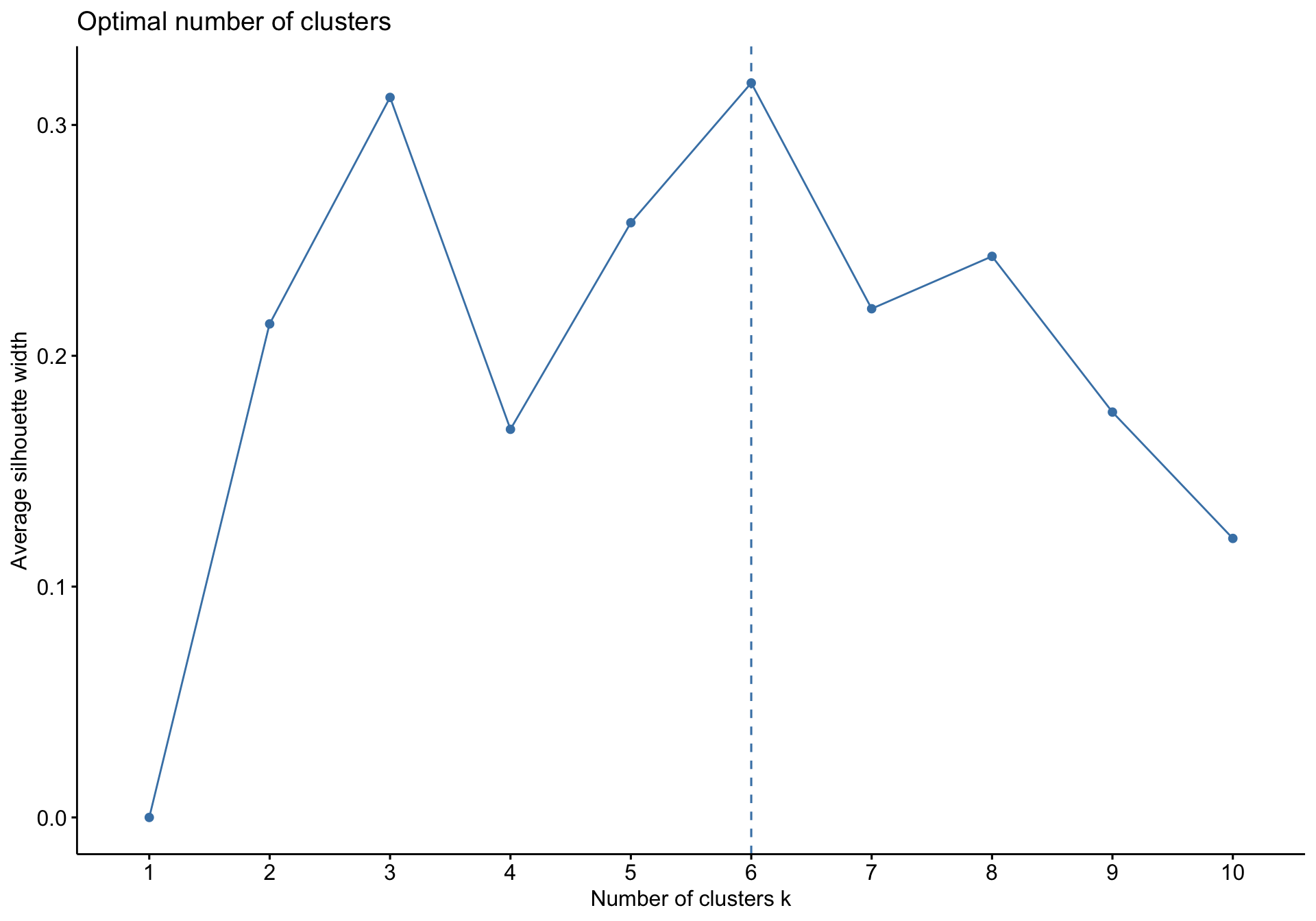Given visual examination of the plot, six clusters seems to be a good starting point. The average silhouette method is another visulization useful for confirming the number of cluster groups for our cluster modelling.