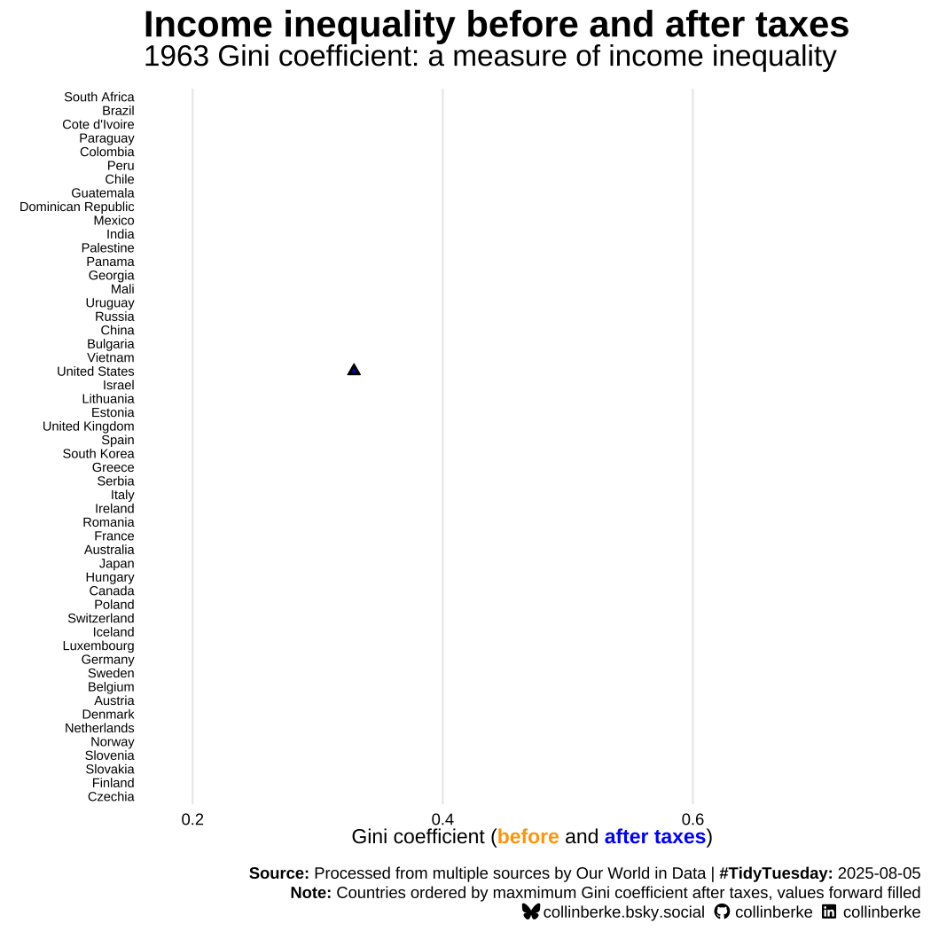 This week’s TidyTuesday included data exploring Income Inequality Before and After Taxes. The article “Income inequality before and after taxes: how much do countries redistribute income?” by Joe Hasell inspired this week’s data. The data were processed by Our World in Data, and they orignated from various sources (see the documentation for more info).