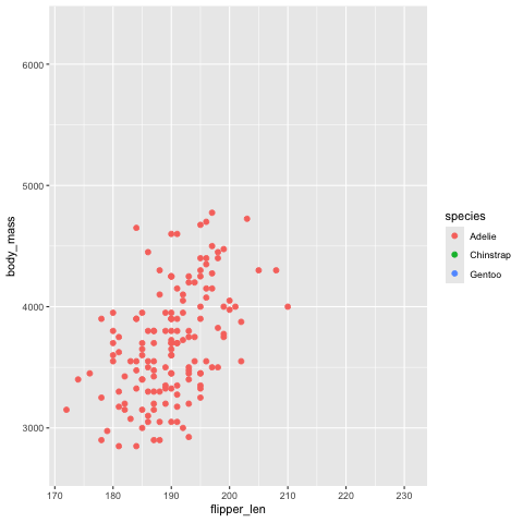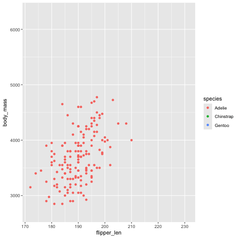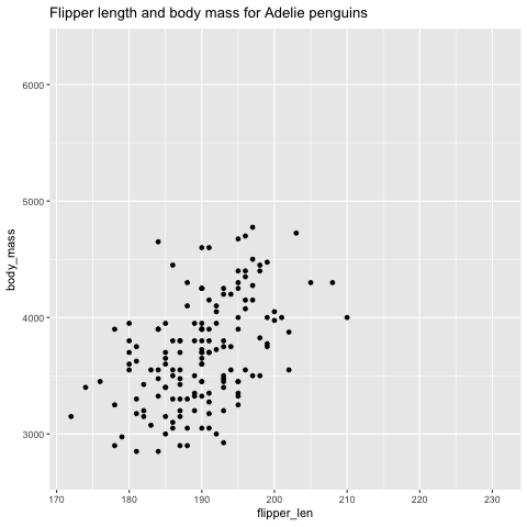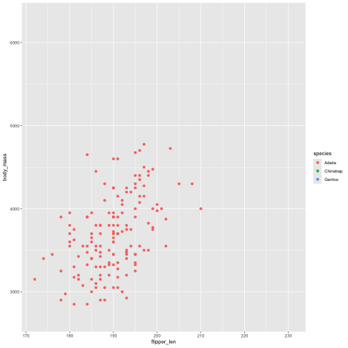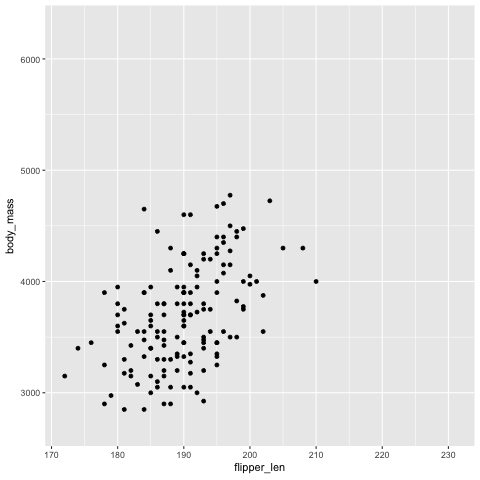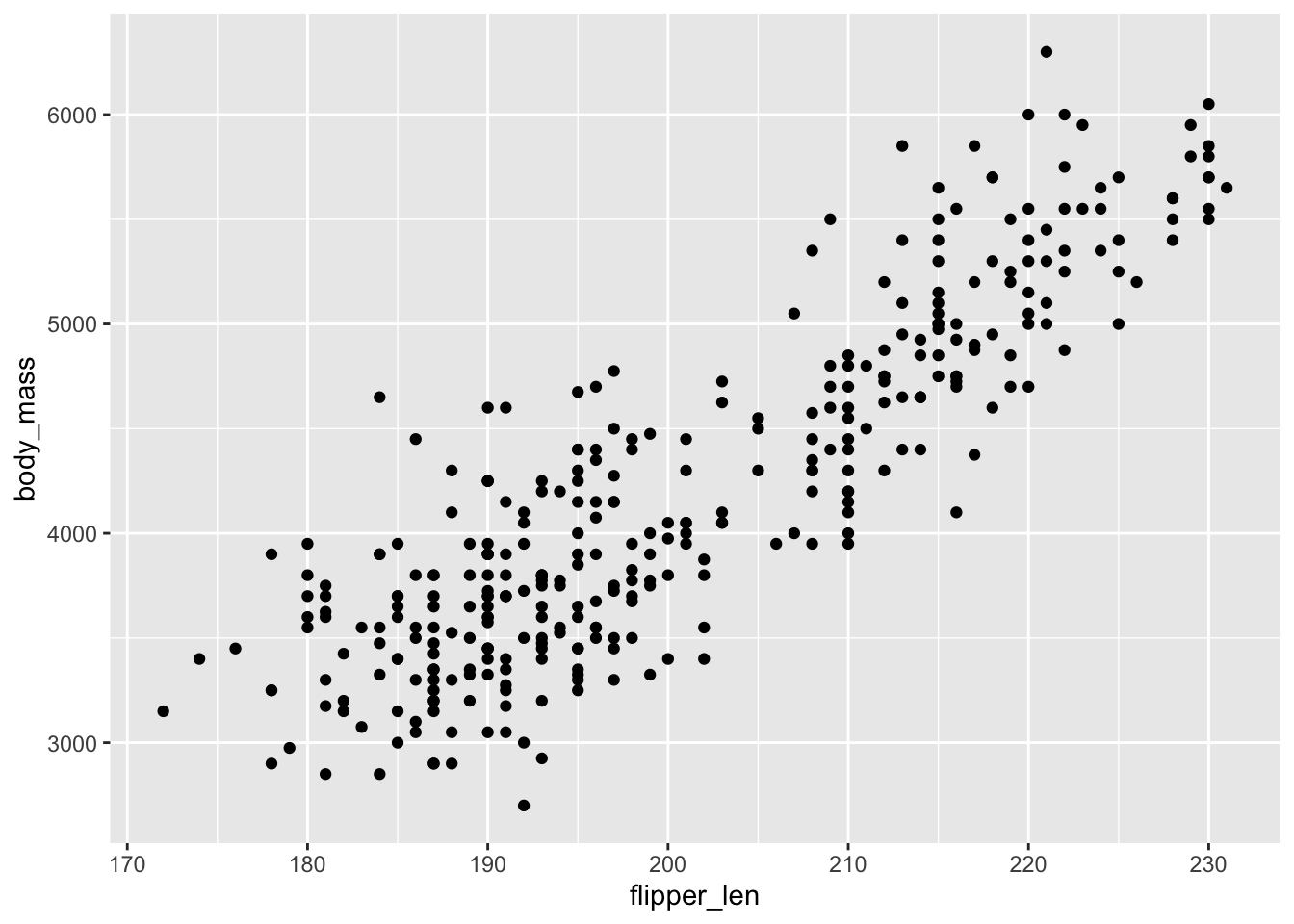 Let’s start with the penguins data set, where we can create a static scatterplot of flipper_len by body_mass. In other words, we want to answer the question: how do bigger flippers relate to a penguin’s mass? (i.e., are penguins with longer flippers heavier?).