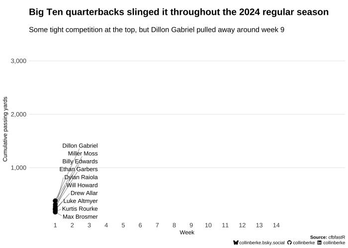 This post also provided an additional example to go beyond just reviewing the docs. This example animated time series data of Big Ten QB passing from the 2024 NCAA football season.