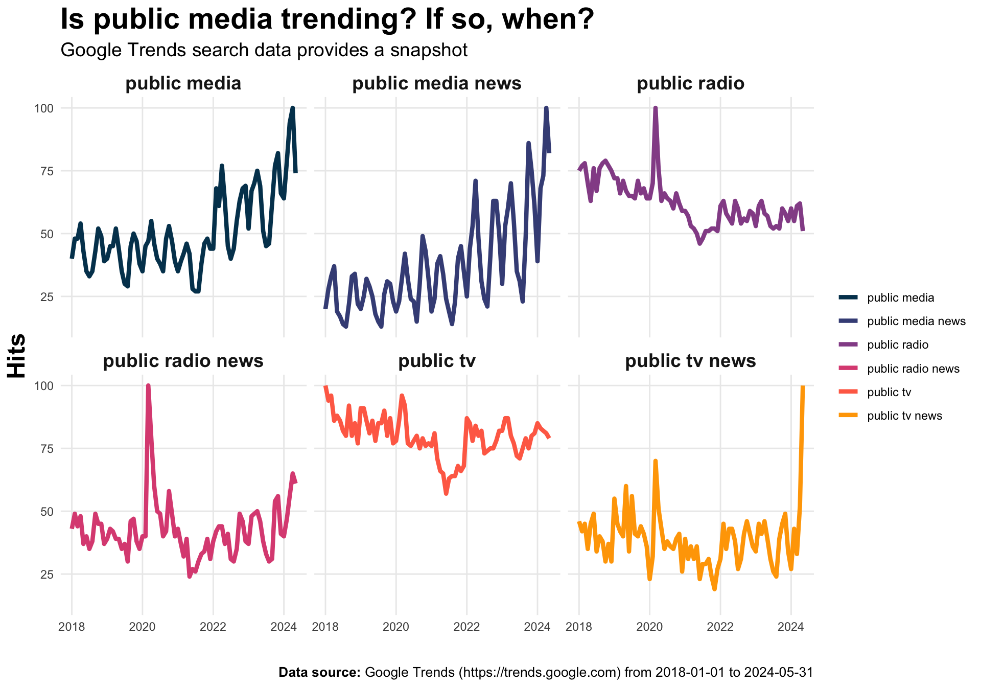 There’s a few things to keep in mind when reviewing these trends. Hits represent actual search requests made to Google. However, hits are normalized to allow for relative comparisons to be made across time periods and terms. I used the Google Trends API to extract each term individually, rather than together. Extracting data this way allows for comparisons to be made over time for each term, but it takes away the ability to make comparisons across terms (i.e., we can’t conclude that public tv is trending higher than public radio using this chart). You can check out the full details about Google Trends data here. If you’re inclined to read a more in-depth explanation of how I did this, expand the call-out below to learn more.