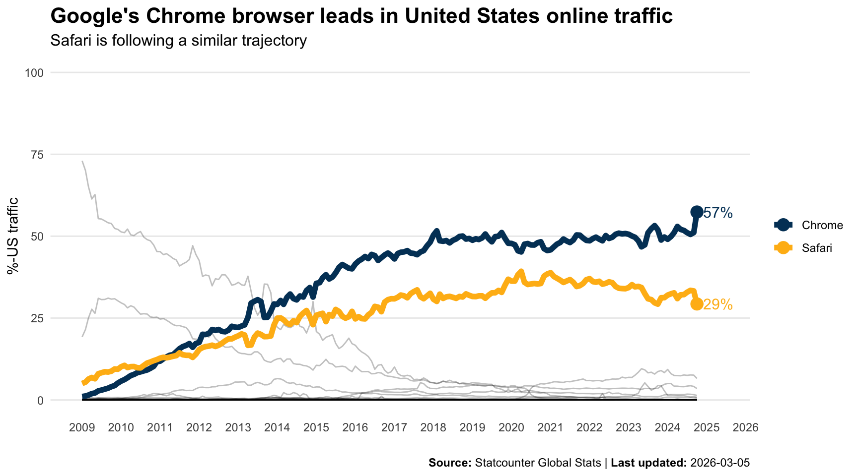 With all the talk about the end of the end of cookies in the Chrome browser, I wanted to know more about how much Chrome was being used in the United States. Specifically, I had the following questions: How much is the Chrome browser being used? What other browsers, if any, compete with Chrome? So, I sought out some data and created a plot to ponder.
